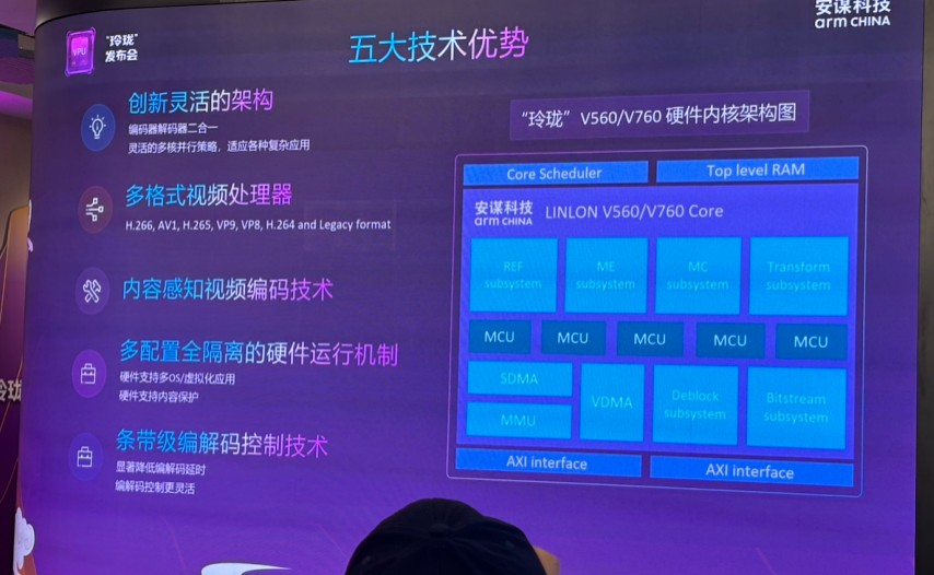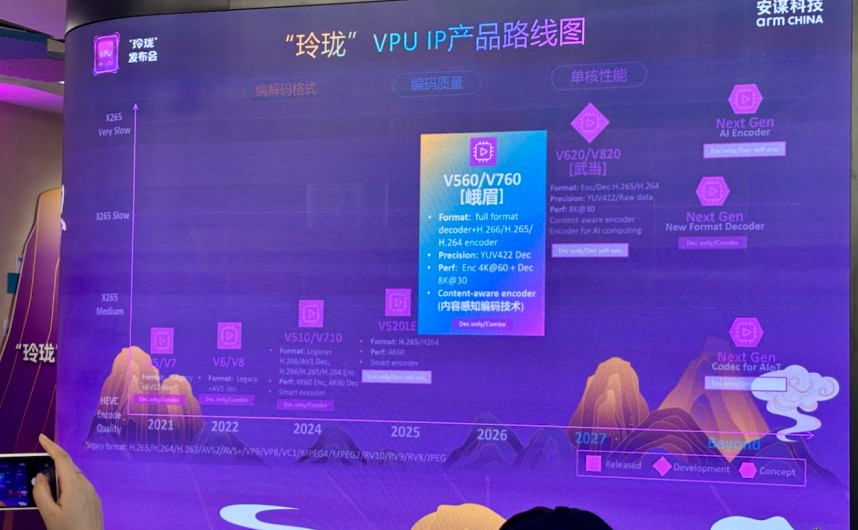 作为“玲珑”系列迄今为止推出的第4代、第5款自研产品,代号“峨眉”的V560/V760展现出了极强的工程落地能力。周华在回顾该产品线的演进历程时提到:从第一代V5/V7开始加入AVS2解码,到V6/V8加入AV1解码,再到V510/V720引入H.266支持并将性能提高一倍,安谋科技始终在编码格式、编码质量与单核性能三条主线上齐头并进。