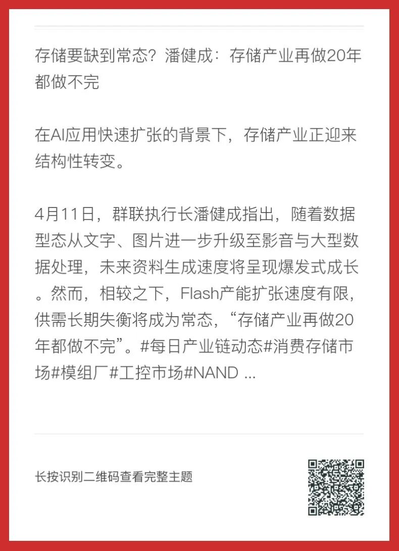 业内人士表示,随着超大型云端企业积极抢购存储器产品,整个产业已迎来新的结构性改变,AI扩建将推动存储器产业进入全新发展阶段。