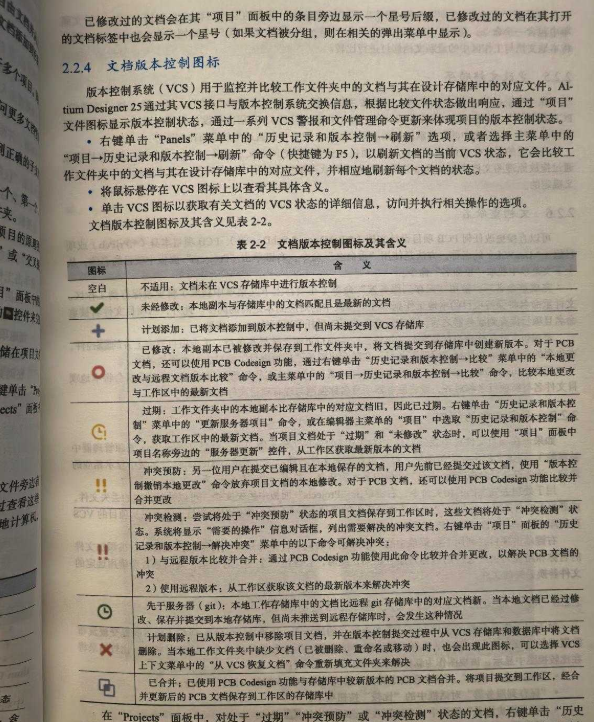 比如下图中所标的文档版本控制图标及其含义。我在没有看到这本书之前,也只是根据我们工程的情况去简单地推测它的功能,我也就见到了对勾圆圈和黄色时钟感叹号这种,在此之前并没有一个系统的文档,能够去充分地了解认识这些功能。但是现在有了这本书,这一切都是系统性的框架种植下来了。