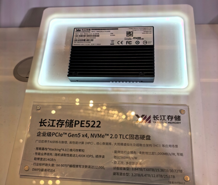 在峰会现场,笔者看到长江存储展示的多款Gen5企业级eSSD新品,PE522性能业界领先,随机读写性能3400K IOPS,顺序读取带宽达到14GB/s,延迟低至5μs,覆盖4TB至32TB容量,耐久度相比上一代产品提升超30%;PE511 是一款PCIe Gen5 高安全 TLC eSSD,搭载X4-9070三维闪存颗粒,4K读写性能高达3300K IOPS,支持盘级与主控级两级加密,提供单根I/O虚拟化功能,最大支持64个虚拟化节点。