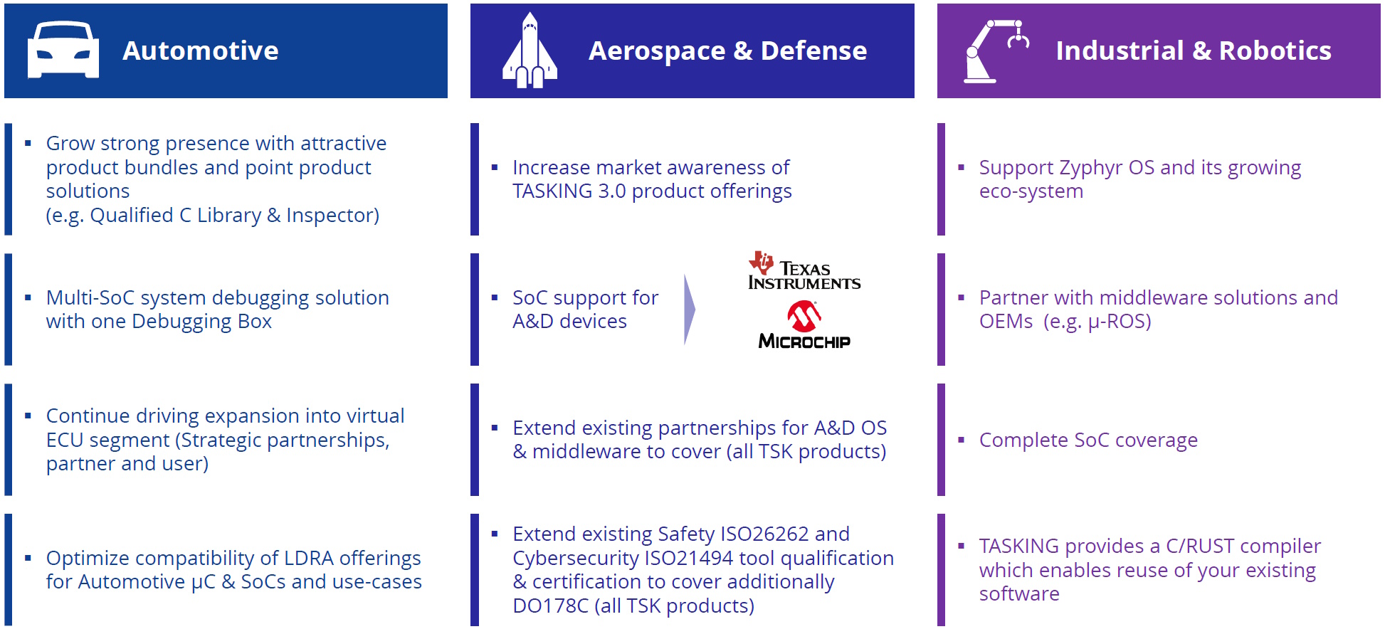 Another notable shift involves the markets TASKING serves. Historically, the company’s tools were most closely associated with the automotive sector, where its compilers became widely used for microcontrollers that power electronic control units (ECUs) in vehicles. Automotive remains an important focus today, but the scope has expanded significantly. With the addition of iSYSTEM’s debugging technology and LDRA’s verification and testing capabilities, TASKING now positions its integrated toolchain for a broader set of safety- and security-critical domains, including aerospace and defense, industrial automation, and robotics.