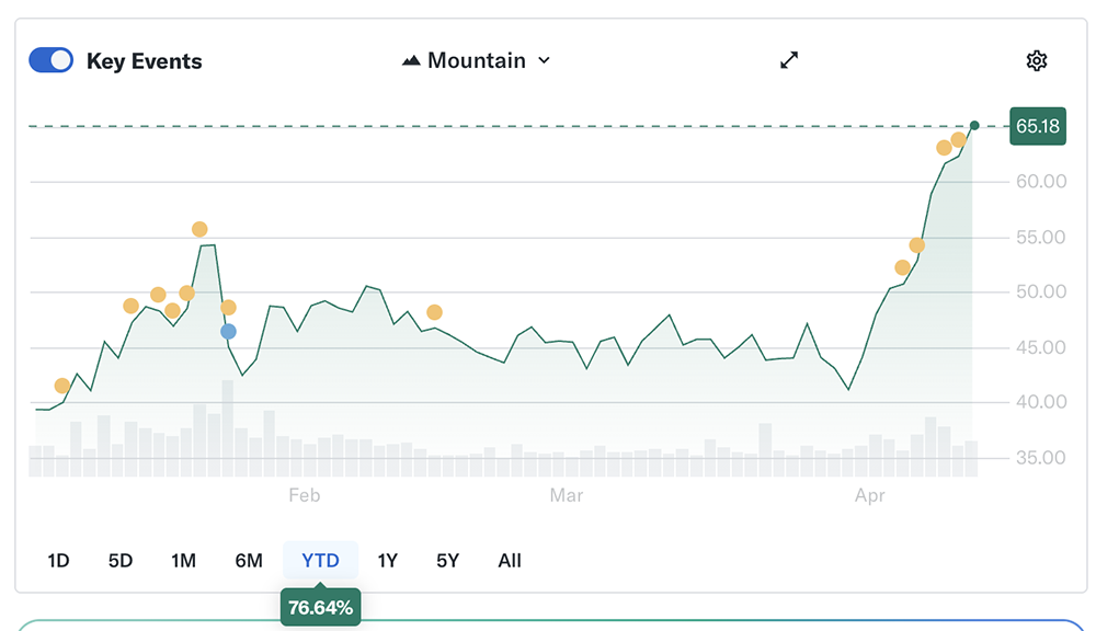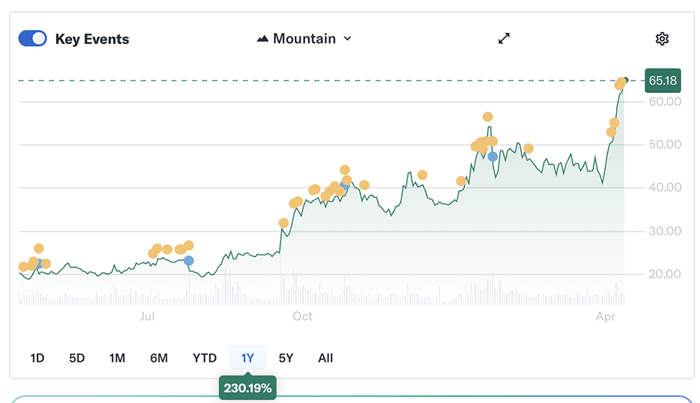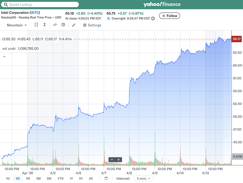 芯东西4月14日消息,短短9个交易日,英特尔股价飙升58%,市值增长超过1200亿美元(约合人民币8184亿元),成为标普500指数中最热门的股票之一。这番上涨源自4月初英特尔同意支付142亿美元(约合人民币968亿元)从阿波罗全球管理公司手中回购其一家爱尔兰工厂的一半股份,此举被视作英特尔扭亏为盈进程取得进展的信号。上周,英特尔宣布将加入马斯克Terafab项目,参与特斯拉、SpaceX和xAI芯片制造,这一消息进一步提振英特尔股价。随后,谷歌承诺将在数据中心采用英特尔至强处理器,并正与英特尔联合开发基于定制ASIC的IPU。美东时间本周一,英特尔股价上涨4.49%。其股价在过去一年涨超230%。今年迄今,英特尔股价累计涨幅超过76%。相比之下,英伟达股价上涨1.5%,AMD股价上涨15%。此前英特尔股价曾在去年飙升84%,主要受英伟达、软银集团乃至美国政府投资的推动。目前英特尔股价仍较2020年的高点下跌了约6%,而标普500指数则上涨了100%以上,这部分得益于英伟达、博通、美光科技等主要AI芯片公司及存储芯片公司的股价飙升。在1月发布的财报中,英特尔预计2026年第一季度营收为117亿美元至127亿美元(约合人民币798亿元至866亿元)。Seaport Group的分析师Jay Goldberg认为,华尔街可能低估了英特尔的长期盈利前景。尽管整个芯片行业的估值完全离谱,但他认为英特尔更有可能超越市场普遍预期。“与英特尔相比,英伟达今年很难取得实质性的业绩增长,英特尔过去几年过得不太顺利,更有可能实现令人惊喜的盈利增长。”他说。
