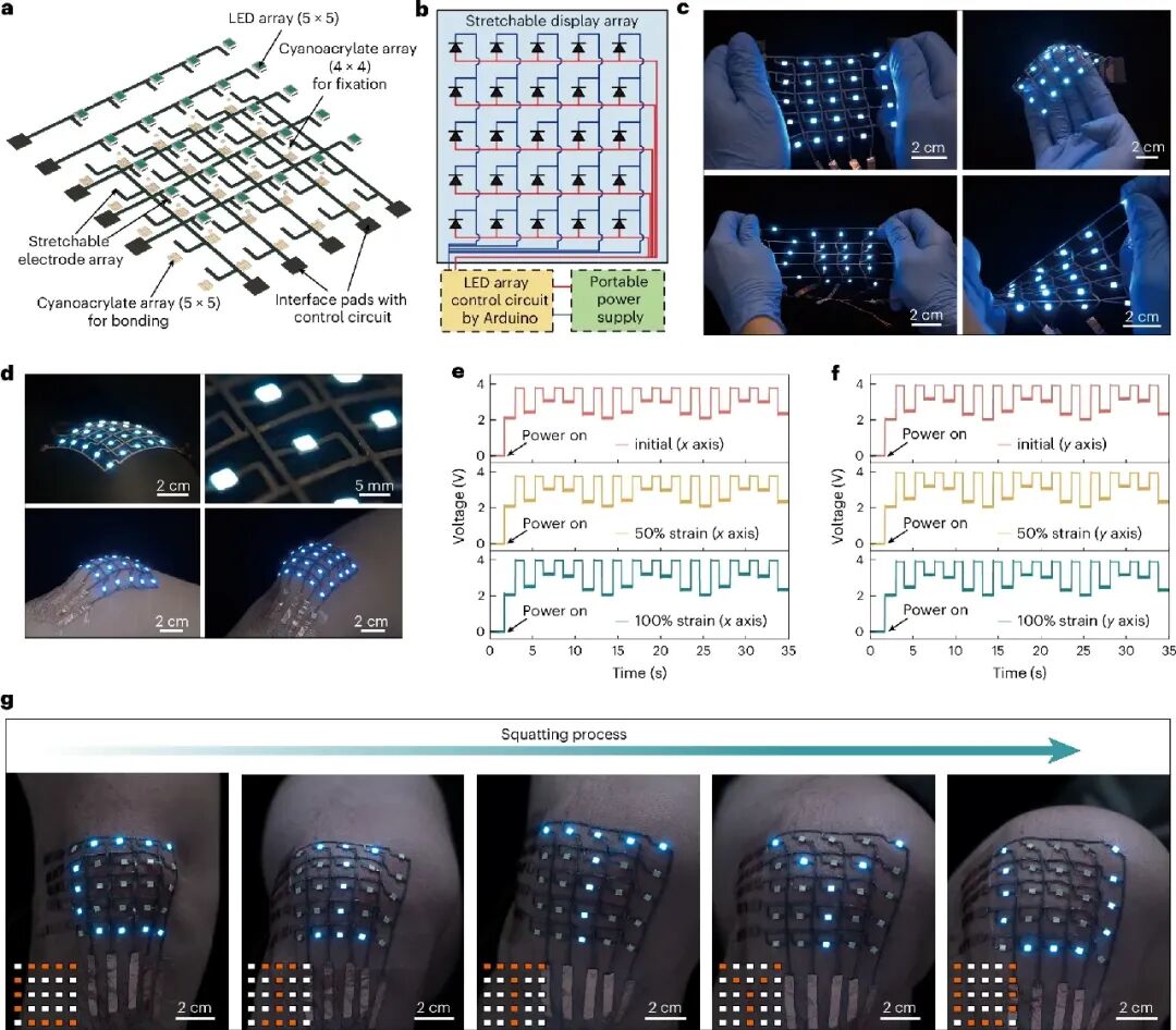 基于三维可拉伸核壳电缆,研究团队构建无基底镂空式可拉伸 LED 显示阵列,由 5×5 LED 阵列与激光切割核壳电缆互联组成,可适配多方向大曲率变形。阵列在拉伸、扭曲、折叠等形变下均保持稳定发光,可与球面、膝关节等高曲率表面共形贴合。在人体膝关节运动过程中,显示阵列随皮肤同步变形,功能不受影响,在人工汗液环境下仍可正常工作,充分证明其在穿戴式混合电子中的高鲁棒性。