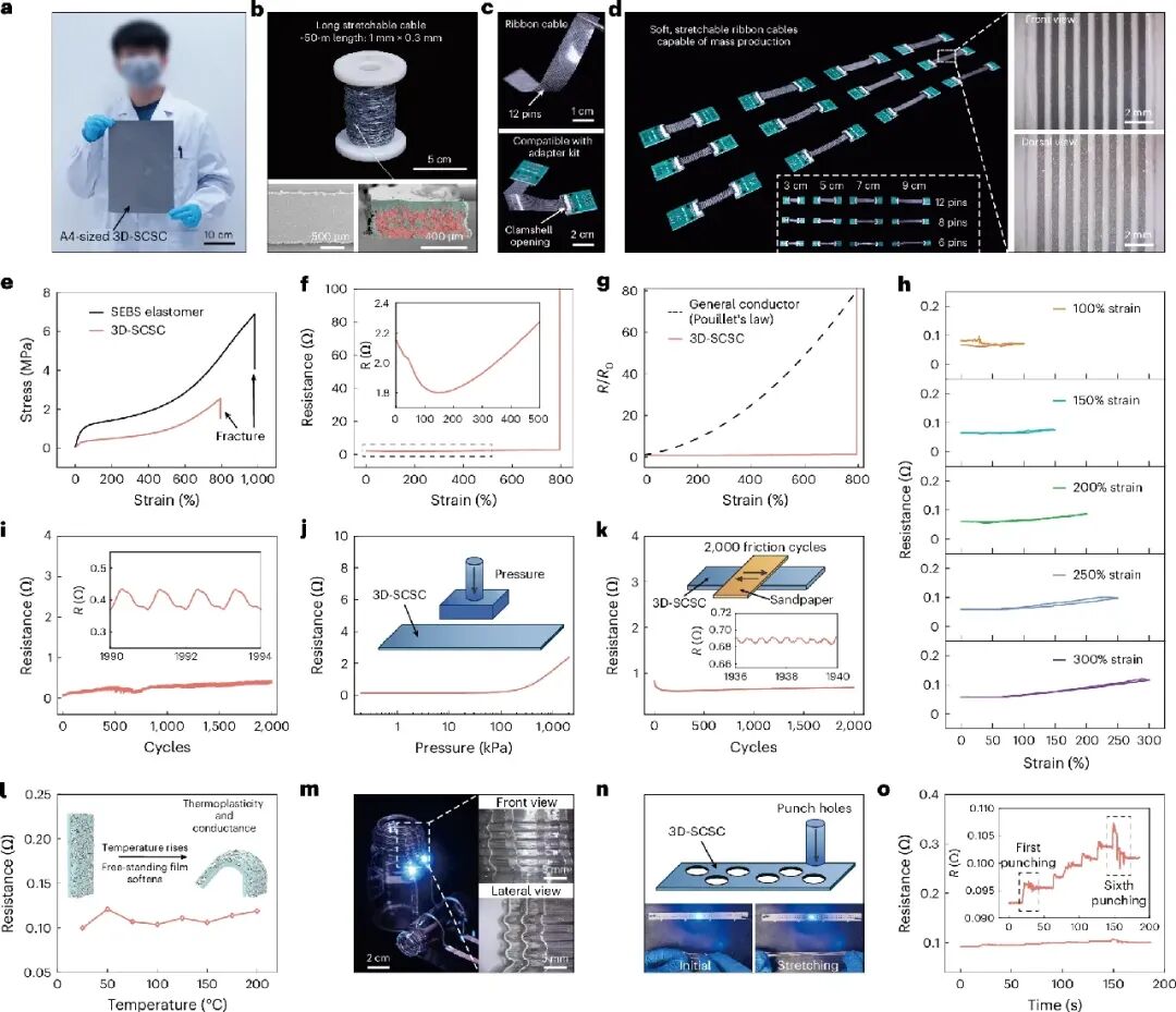 三维可拉伸核壳电缆采用溶液共混与流延成膜工艺制备,将液态金属与 SEBS 甲苯溶液按比例混合搅拌,利用液态金属与聚合物体系的密度差异,使导电颗粒自然沉降并形成三维连通网络。待溶剂完全挥发后,得到均匀稳定的核壳结构复合膜。研究团队采用激光切割与热压作为核心加工方式,可实现从晶圆级、A4 大面积膜到约 50 米长工业线缆的多尺度制备,同时可批量加工 6 针、8 针、12 针等规格的可拉伸带状线缆,直接兼容商用转接套件。整个制备流程为平面化工艺,重复性高、适配性强,具备规模化生产潜力。