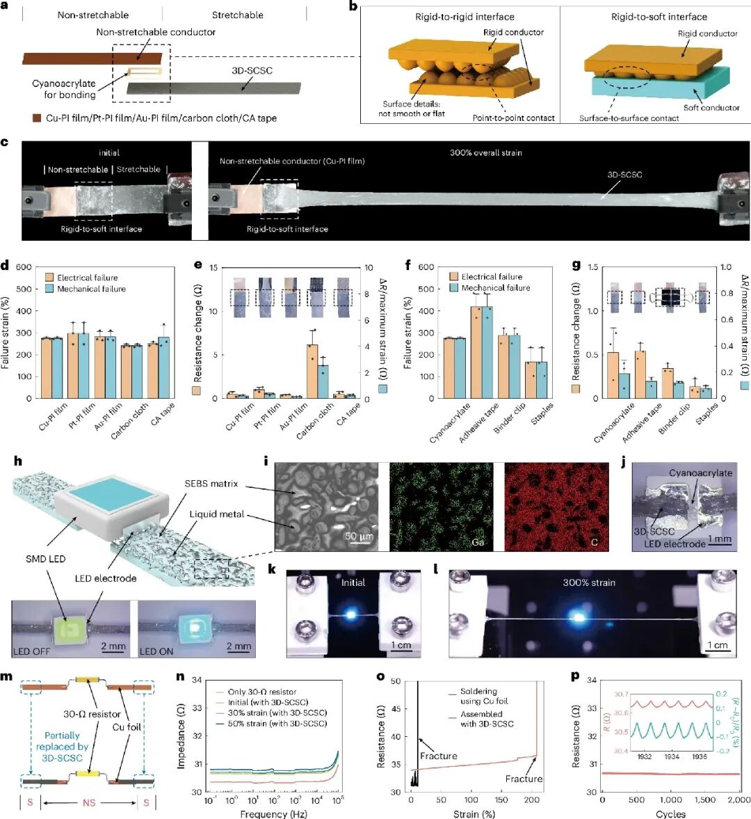 核壳结构使液态金属承担导电功能、SEBS 承担力学支撑,在与非拉伸刚性元器件连接时,可通过室温商用快干胶实现稳定键合。界面接触电阻低,且线缆低模量特性可形成充分的面接触,显著提升界面可靠性。研究验证了该线缆与铜 PI 复合膜、铂膜、金膜、导电碳布、导电胶带等多种常用导体的适配性,采用胶水、胶带、夹扣、订书钉等多种连接方式均能实现稳定互联,并大幅提升整体电路拉伸性能。将其作为互联线与 SMD LED、电阻等器件组装,可构建无基底自支撑柔性电路,在 300% 应变下仍保持稳定工作,混合电路断裂应变较纯铜箔线路提升 18 倍,具备优异的软–硬混合集成能力。