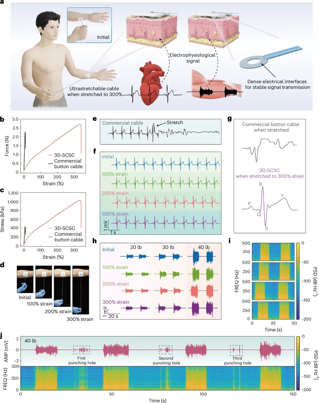 图 | 用于抗噪声电生理信号采集的三维可拉伸核壳电缆