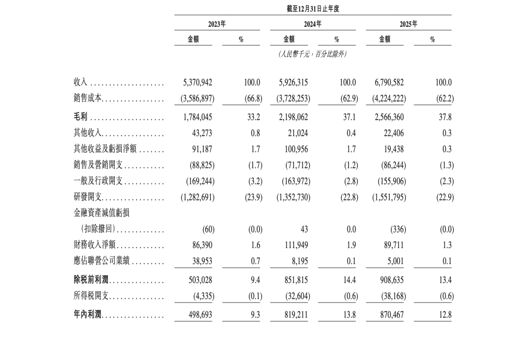 从业绩表现来看,晶晨股份近年来保持稳健增长态势。招股书显示,2023年至2025年,公司营业收入分别为53.71亿元、59.26亿元、67.91亿元,逐年稳步提升;年内利润分别为4.99亿元、8.19亿元、8.70亿元,2023年至2024年利润同比增幅达64.3%,2024年至2025年同比增幅为6.3%,盈利能力持续增强。毛利率方面,公司毛利率从2023年的33.2%提升至2024年的37.1%,2025年维持在37.8%的较高水平,体现出较强的成本控制能力和产品竞争力。