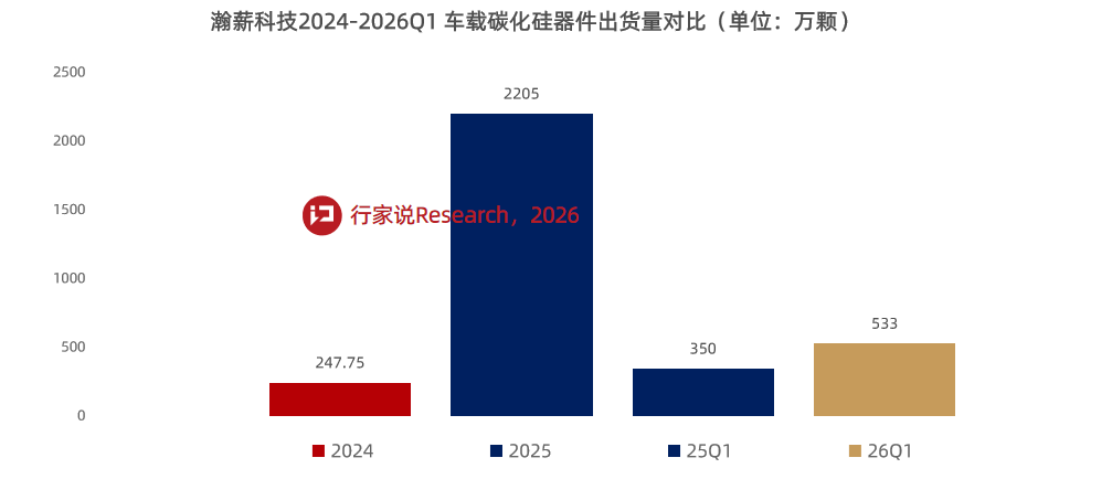 车载碳化硅成为拉动瀚薪科技增长的核心引擎。据介绍,今年1—3月瀚薪科技的车载碳化硅产品的出货量达到533万颗,占比高达71%,同比大幅增长52%。而2025全年该公司的车载产品出货量占比71%,达到2205万颗,同比增长近790%。