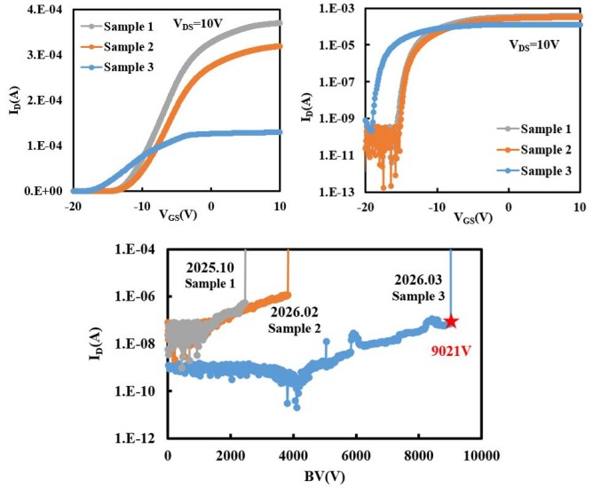 本次九峰山实验室团队通过双层源场板结构设计,有效调制了器件内部电场分布,成功实现9.02 kV的击穿电压。该器件在VGS=5V、VDS=10V条件下正向导通电流达120 μA,充分验证了氧化镓在超高压电力电子领域的巨大应用潜力。