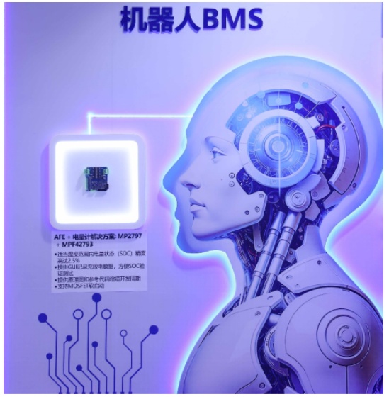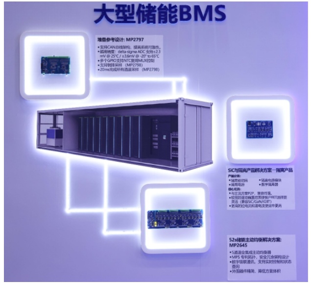 方案,涵盖电池监控和保护器、主动均衡、电量计以及DC/DC功率变换模块等关键技术,通过高度集成的方案帮助客户提升系统效率并简化设计复杂度。同时,MPS还展示了面向大型储能及机器人的BMS解决方案,全面呈现了其在储能应用领域的技术布局。