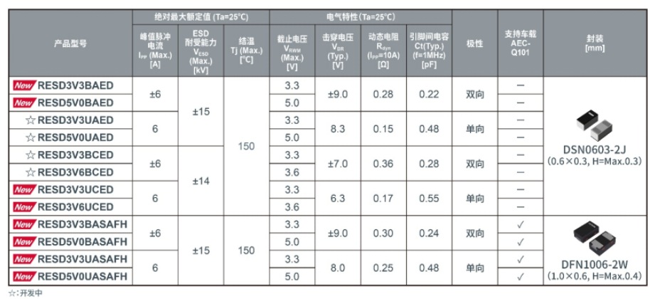 DSN0603-2J封装:RESD3V3BAED、RESD5V0BAED、RESD3V3UCED、RESD3V6UCED