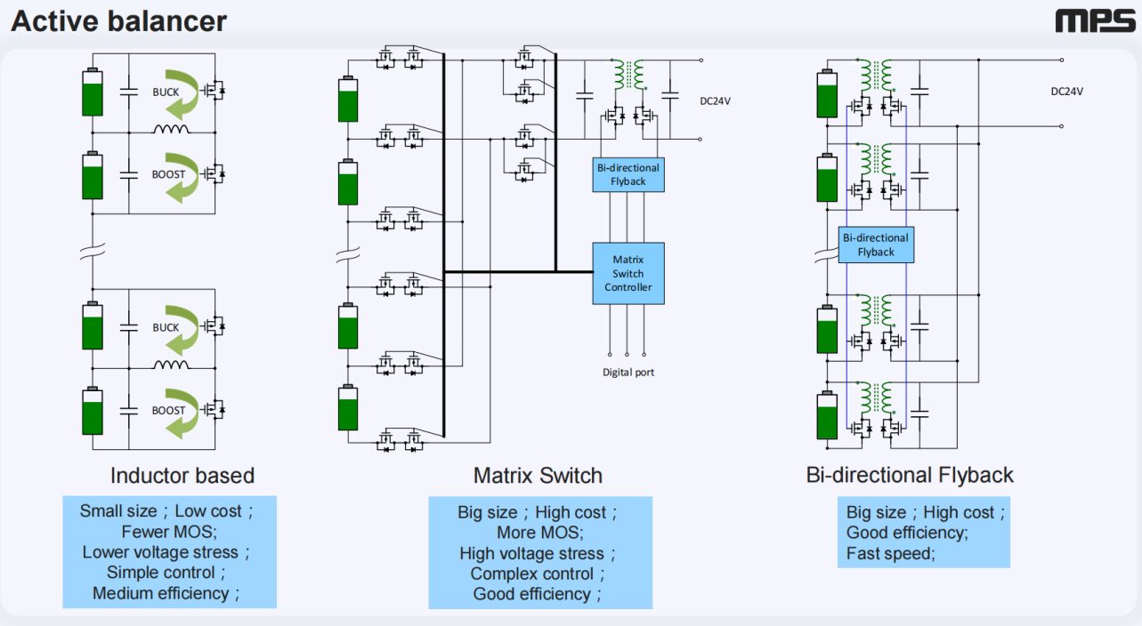 第一类方案——基于电感的相邻式均衡,是MPS重点投入方向。该方案中MOS管仅需承受两节电芯电压,可充分利用MPS的集成工艺,将控制、诊断及冗余电路集成于IC内部。通过高频控制,电感体积可大幅缩小,且集成化有助于降低成本。随着量产规模扩大与研发成本摊薄,该方案具备良好发展前景。总体而言,主动均衡技术仍需在可靠性、成本与体积三方面持续优化。