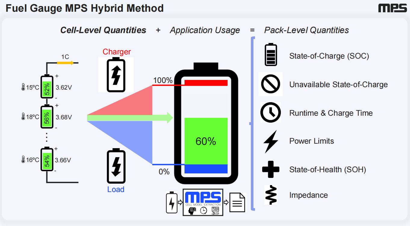 随着大容量电池特别是磷酸铁锂电池的大规模应用,以及锂电池在更多场景中的普及,众多应用对锂电池SOC(荷电状态)和SOH(健康状态)的估算精度提出了更高要求。MPS持续投入电量计算算法的开发,推出基于硬件芯片的电量计方案。该方案可替代传统在MCU上运行的软件算法,直接通过芯片寄存器输出单体电芯的SOC、SOH、阻抗等关键参数,从而显著缩短客户的软件开发周期,加快产品落地。
