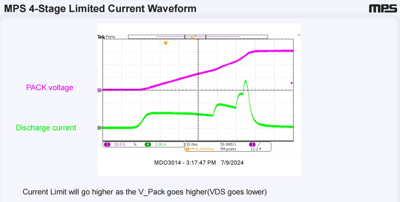 在短路保护方面,MPS经过大量测试,将保护响应时间设定在20–40微秒区间,实测米勒平台时间为26微秒,有效避免MOS管热击穿。该时间窗口可根据客户需求调整。