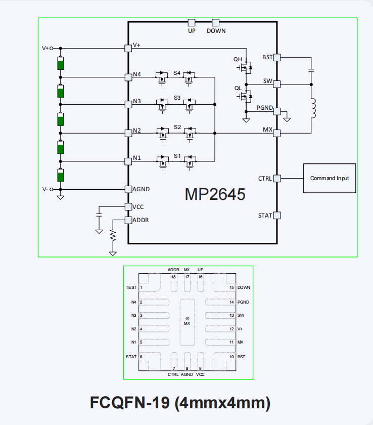 MPS推出的MP2645是一款全集成五通道电池均衡器,采用专利拓扑结构,单颗芯片配合一个电感即可实现五节电芯的均衡。其均衡电流达3.75 A,控制精度为5%,待机功耗低至2.5 μA。该产品从多方面回应前述挑战:首先,每个MOS管承受的最大电压应力对应五节电芯(通常不超过20 V),芯片采用40 V耐压工艺,提供一倍安全裕度;其次,集成数字通信接口,支持主动均衡过程中的实时状态查询与异常诊断;第三,内置看门狗电路,可在MCU失效时自动进入安全状态,防止电池过放;第四,产品符合AEC-Q100标准,提供工业级与车规级Pin-to-Pin兼容版本;最后,在体积方面,16串电池包仅需4颗芯片与4颗电感,外围元件可单面贴装,整体体积接近两枚硬币大小。芯片尺寸为4 mm × 4 mm,配套电感尺寸为4 mm × 4 mm或5 mm × 5 mm。对于更高串数电池组,该芯片支持菊花链通信接口,采用单线控制,对MCU资源占用极小。配套评估套件与上位机软件可快速验证均衡效果,用户仅需接入电池包即可运行预置控制算法。