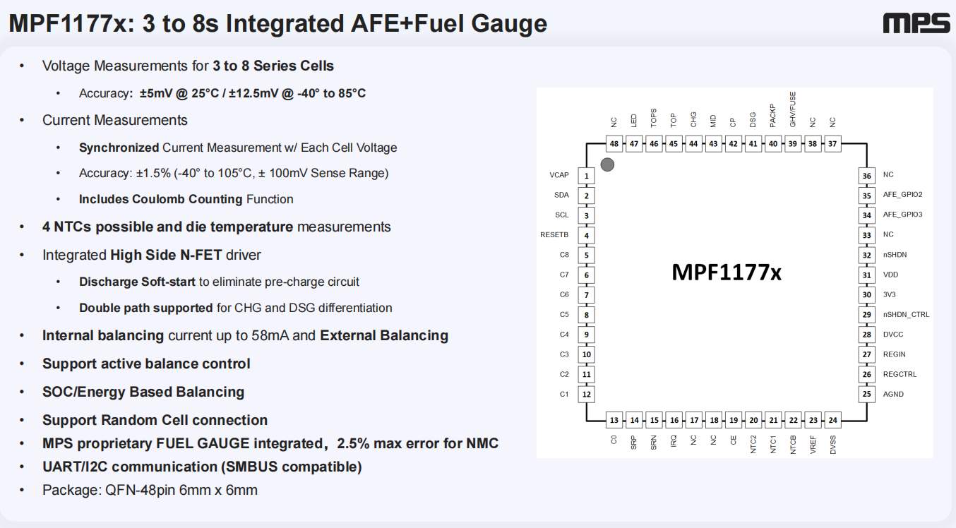此外,MPS还最新发布了MP1177x产品,可实现对磷酸铁锂电池的良好支持。据悉,该产品集成了模拟前端(AFE)、高边驱动、电量计以及主动均衡控制功能,实现了四合一的高度集成。在AFE功能维度,MP1177x延续了高精度的电压、电流及温度采样技术架构;在高边驱动维度,该产品支持软启动功能。此外,芯片内部集成了数字处理单元,能够实时计算并提供单体电芯的荷电状态(SOC)、健康状态(SOH)、预估充满时间及预估放空时间等核心参数。基于电芯容量状态,MP1177x支持主动均衡控制,并配备了与MP2645主动均衡芯片类似的无缝通讯接口,可直接驱动并指导主动均衡流程。