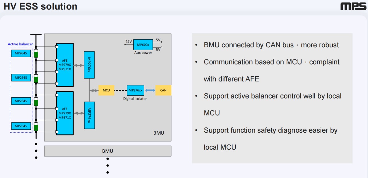 在MPS的CAN总线架构的HV ESS方案中,电池管理单元(BMU)内部采用I²C和SPI隔离通信方式,BMU之间则通过CAN总线连接。王帅表示,储能行业采用CAN总线架构时,优势在于可靠性、灵活性以及对主动均衡的支持。