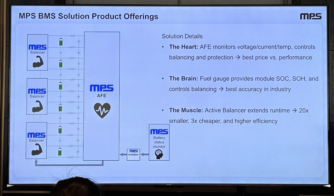单独看产品似乎很难理解其与BMS的关系,而MPS新能源FAE经理王帅(Tony Wang),在现场通过生动的比喻,帮记者梳理了不同产品在BMS系统中的功能和价值。AFE与Battery Monitor负责采集最原始的电压、电流和温度数据,可视为系统的“心脏”;主动均衡则如同“肌肉”,具备强大的能量搬移与均衡能力;而电量计负责对采集数据进行深度处理与计算,并据此指导主动均衡动作。