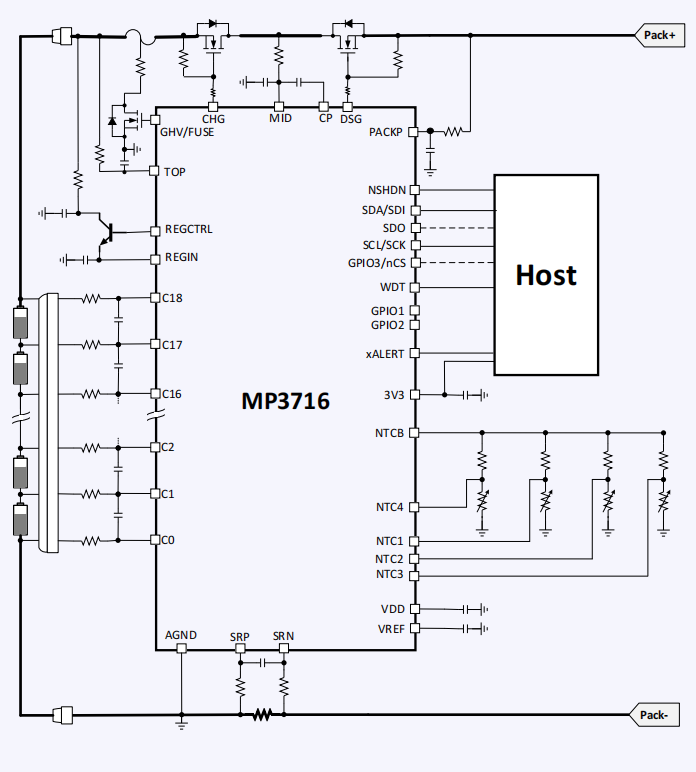 基于上述架构,MPS推出了MP2798系列产品,专为工业储能应用开发。该芯片在-20℃至65℃温度范围内电压采样精度可达±3.6 mV,优于国家标准要求。其采样时间优化至20毫秒内完成全部数据采集与上报。ADC采用Delta-Sigma架构,确保稳定性。芯片集成电流采样功能,支持电压与电流同步采样,可用于电池直流内阻计算。外围支持四路标准NTC接口,并内置被动均衡电路及高集成度LDO。此外,该产品针对工业应用场景进行了多项可靠性设计。