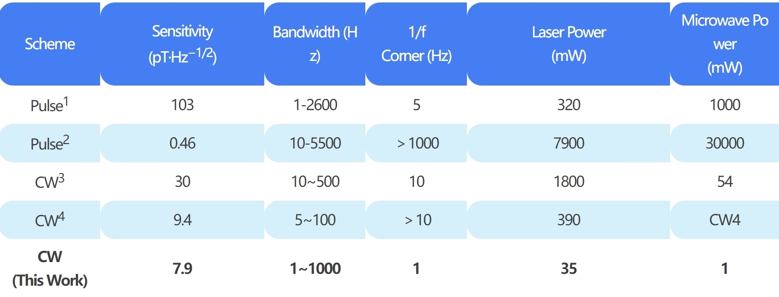 同时在1至1000 Hz范围内实现了7.9 pT·Hz-1/2的优异灵敏度,为连续波光探测磁共振模式下的最优灵敏度之一,尽管一些先进的脉冲式或微波读出方案在较高频率下可实现更优的灵敏度指标,但本工作在抑制1/f噪声与近直流灵敏度方面具备显著优势,有利于低频/静磁场的高灵敏探测应用。
