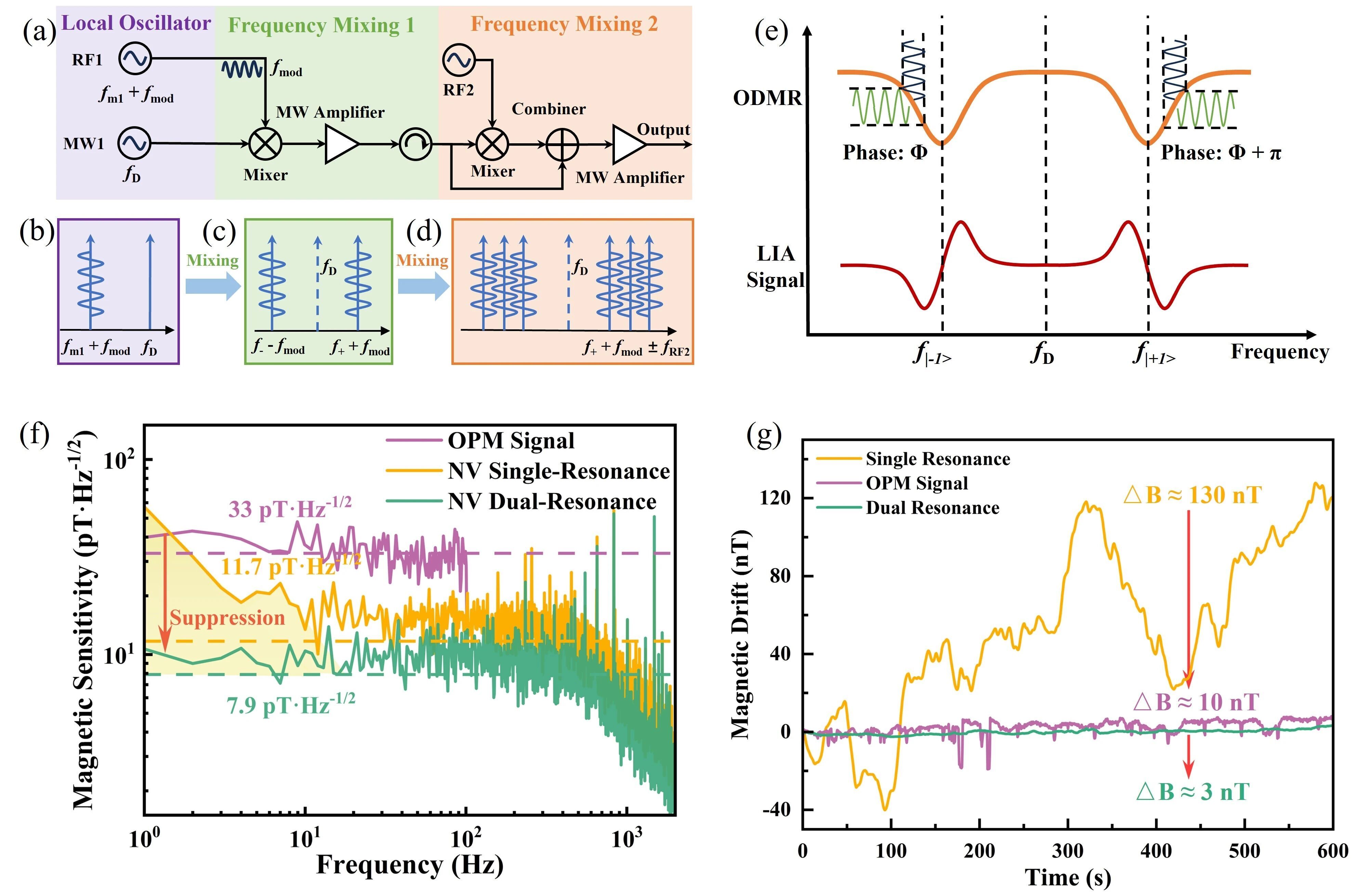 (a)双共振测试系统示意图;(b)本振源信号;(c)一次混频示意图;(d)二次混频示意图;(e)π相位调制解调示意图;(f)单共振、双共振与OPM灵敏度对比(g)长时间时域磁场测量