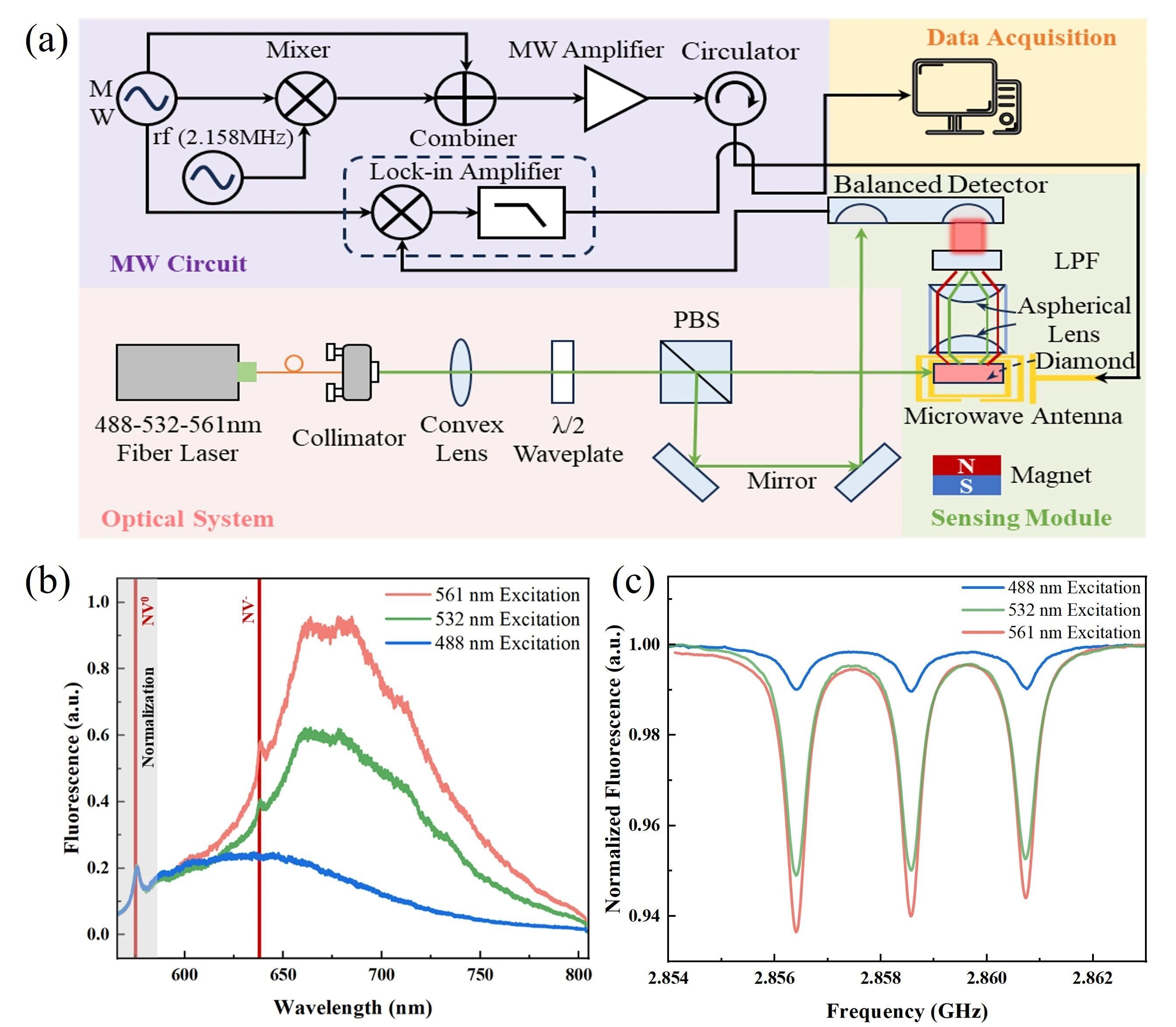 a)低噪声测试系统;(b)不同激发波长下金刚石光致发光光谱;(c)不同激发波长下ODMR谱