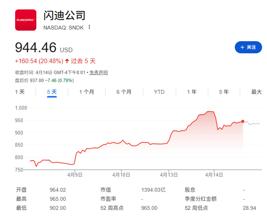 闪迪已多日盘大涨,连续第四个交易日刷新收盘历史新高,14日收盘于952.5美元,年初至今累计涨幅已达301.26%。