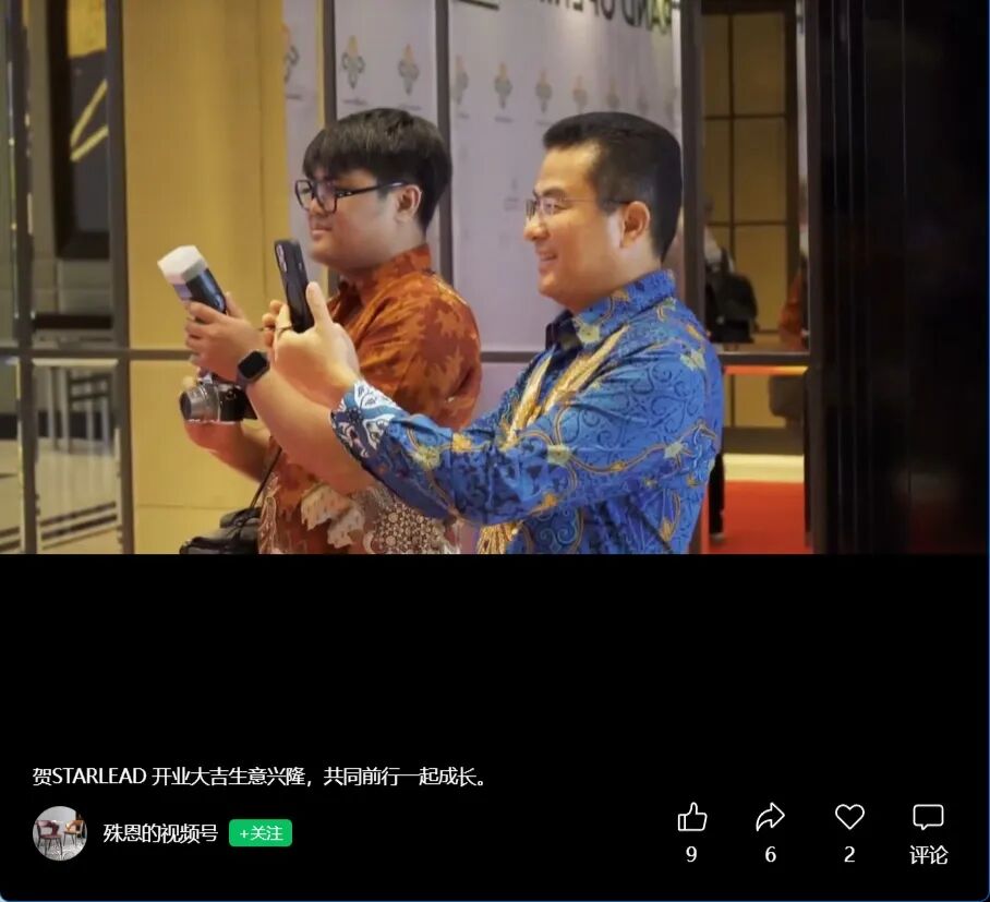 该照片源于一篇关于Starlead公司2025年7月的开幕文章。据多个印尼相关账号发布的图文显示,2025年7月20日,Starlead Group总部及旗下办公家具品牌Prospace展厅在雅加达Alam Sutera的Kino Tower盛大开幕,照片中站在最右侧、身穿蓝色传统服饰的男士面部特征与刘立荣高度相似。