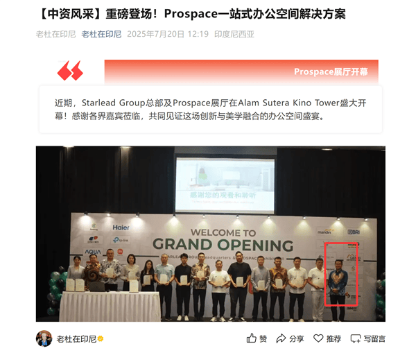 在小红书等社交平台上,自称是Starlead与Prospace创始人的何星介绍称,公司办公及家具品牌在印尼专卖店超过20家,合作品牌包括Herman Miller、Steelcase等国际知名办公家具品牌。