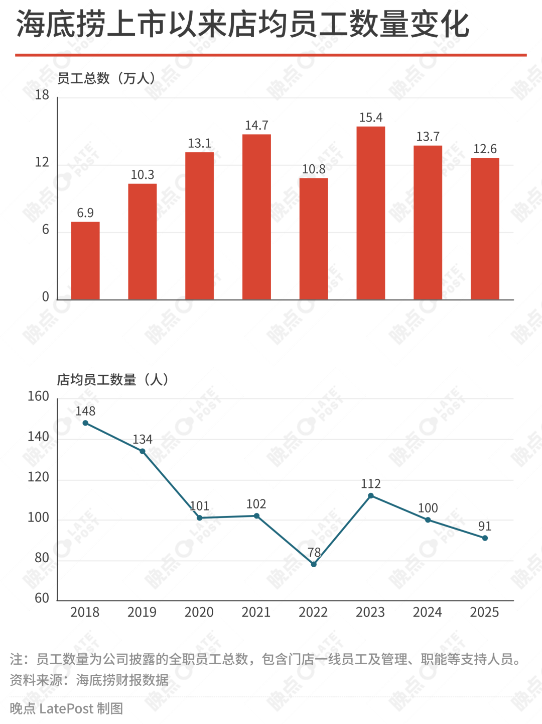 根据海底捞历年年报数据,疫情前,一个门店平均员工人数为 148 人,2025 年已经降到 91 人。