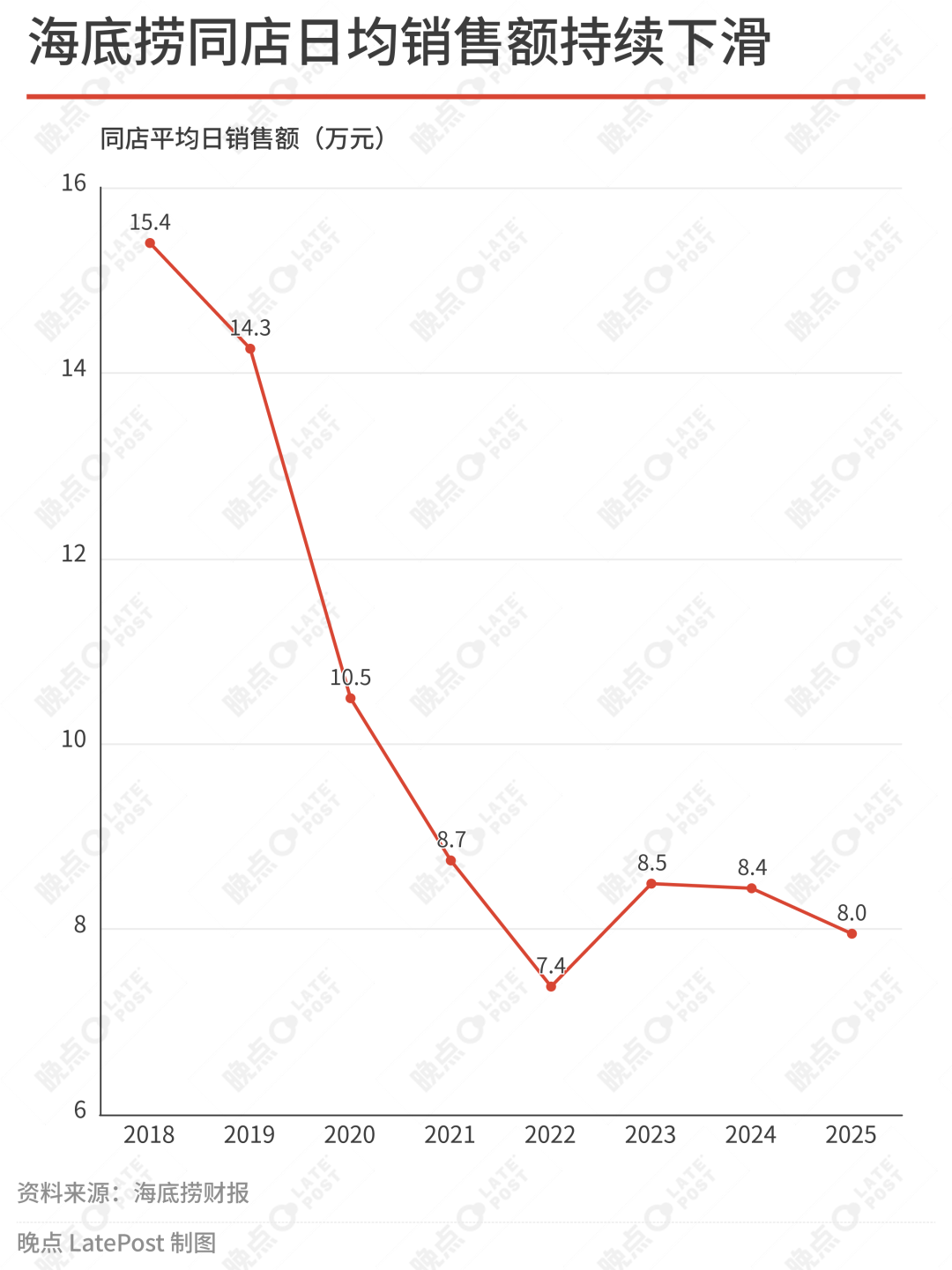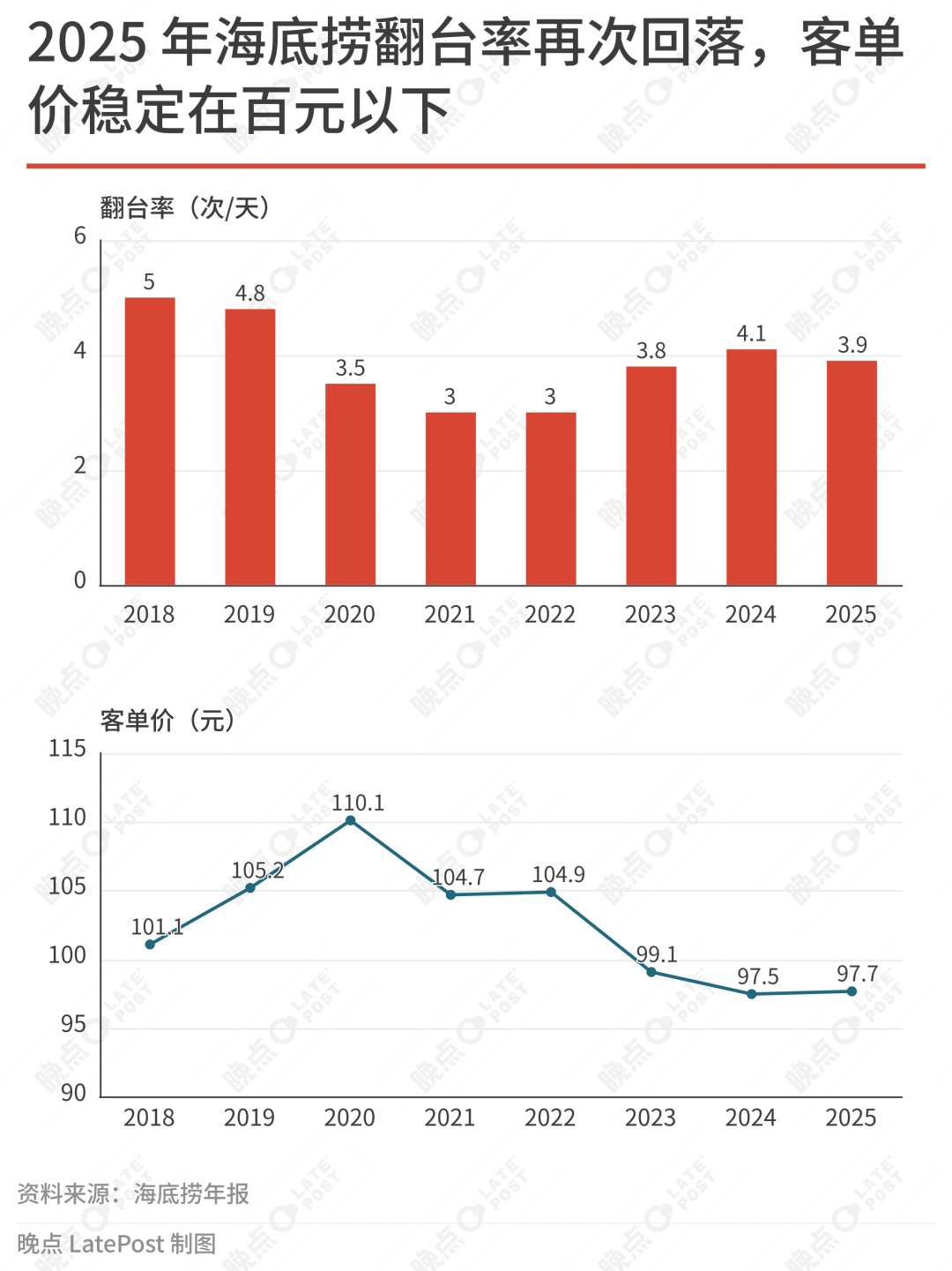 2025 年,海底捞净利润下滑 13.3%,餐厅营收同比下降 7.1%;门店总数自 2022 年起已经没有什么增长。海底捞认为翻台率的及格线是日均 4 次,过去六年中,仅有 2024 年平均达标。