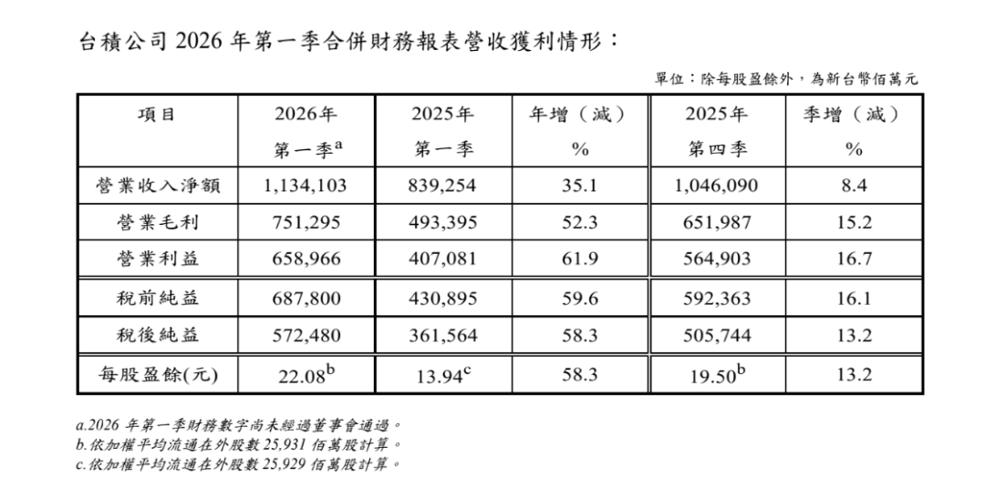 台积电一季度合并营收约新台币11,341亿元,同比增长35.1%,环比增长8.4%,创下历史新高;税后净利约新台币5,724.8亿元,同比增长58.3%,环比增长13.2%,创下历史新高;每股收益为新台币22.08元(折合美国存托凭证每单位为3.49美元),同比增长58.3%。