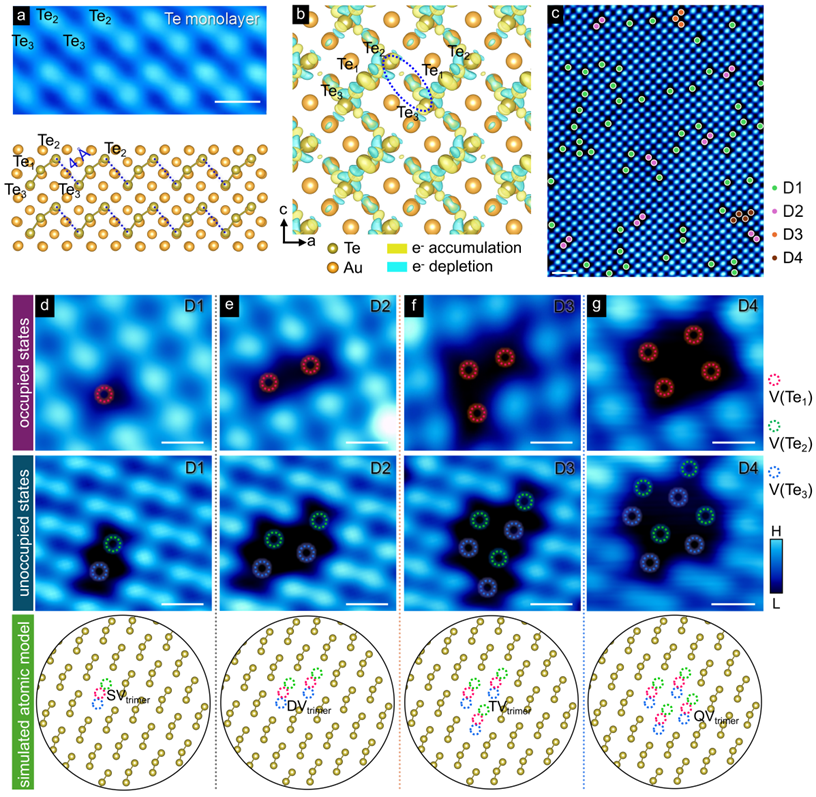 图3. 单层 Te 里的本征缺陷。由于基底诱导的电荷极化,Te1-Te2 和 Te1-Te3 键被削弱,所以单层更容易形成三聚体空位(Vtrimer)。不同缺陷 D1、D2、D3、D4 分别对应三聚体空位的不同倍数。