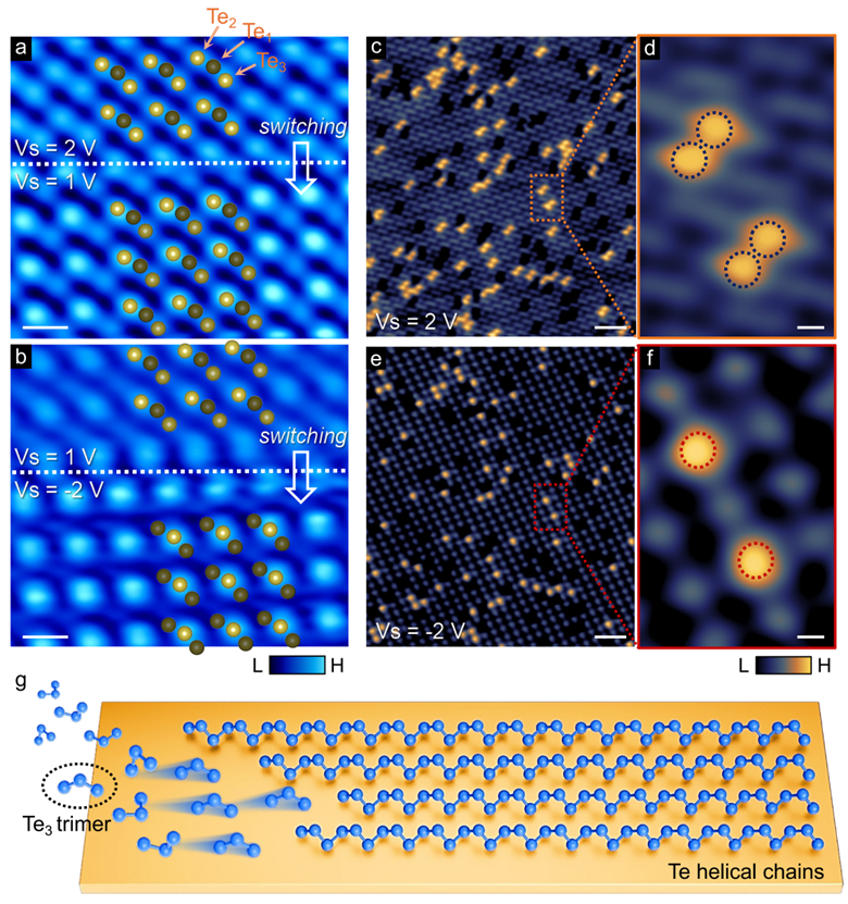 图2. Te3 三聚体是 Te 链生长的“乐高积木”。通过切换偏压,同一个局部突起在负偏压下像“单原子”,在正偏压下又分成“双原子”特征。据此,表面真正的基本单元不是单个 Te 原子,而是带有不对称电子分布的 Te3 三聚体,它们进一步拼装成螺旋链。