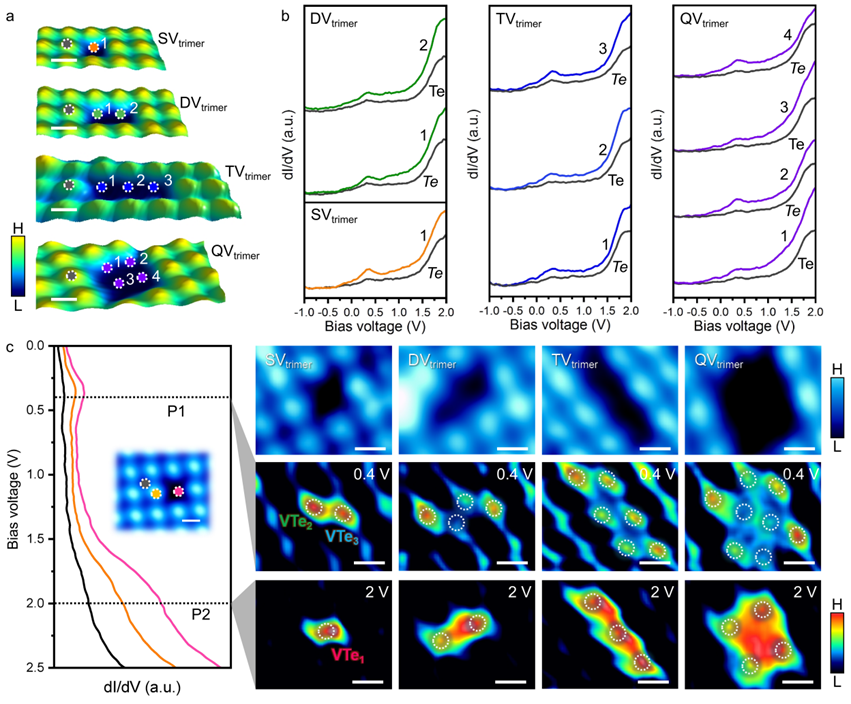 图4. 三聚体空位缺陷的电子态性质。dI/dV结果表明,空位位置在费米能级以上出现明显增强的局域态密度。两个主要峰 P1和 P2分别主要来自不同缺失 Te 位点的悬挂键。