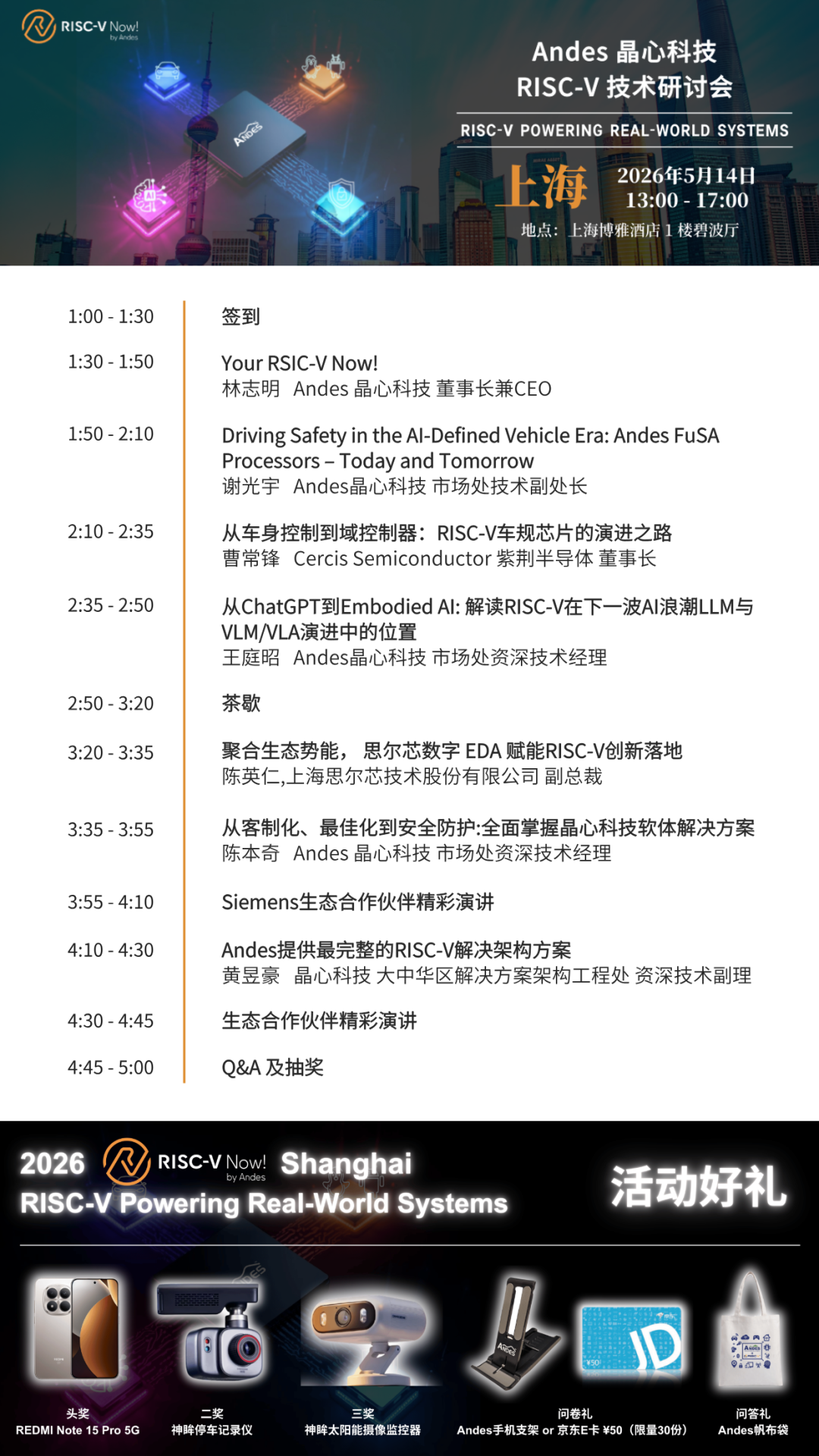 Andes晶心科技汇聚了客户、生态系伙伴,以及正准备将RISC-V导入芯片、软件与系统整合的开发团队,共同分享在商业规模下部署RISC-V的实战经验。不只谈标准,我们更深入探讨开发执行面的现实问题:包含架构决策、软件工具链、系统整合以及最终的商业效益。让我们一起RISC-V Now!5月12日北京站、5月14日上海站,一同剖析全球社群动态与未来的关键趋势,助您精准掌握RISC-V的爆发性成长机会!Andes晶心科技年度盛会,等你来参与!