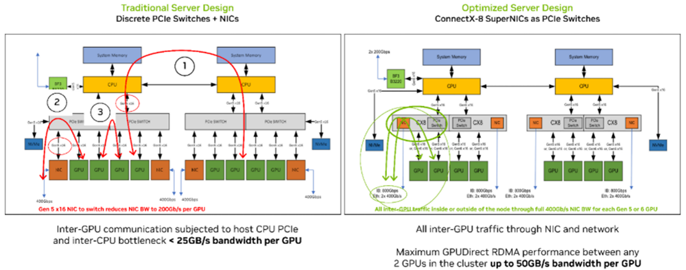 NVIDIA公开表示,ConnectX-8是业界首个把PCIe Gen6级交换能力与超高速网络处理能力集成到单一器件中的超级网卡(SNIC)。它不仅服务于AI、HPC和超大规模云数据中心场景,还通过集成48 lanes 的PCIe Gen6 Switch,把原本需要独立PCIe Switch和独立NIC共同完成的任务,整合到一个高集成度器件中,这是一项绝无仅有的创新技术路径。传统1机8卡PCIe GPU服务器普遍采用以 CPU 为根节点、PCIe Switch 向下连接 GPU 的树形拓扑。这种架构在通用计算时代较为成熟,但在大模型训练场景下,其结构性性能瓶颈日益突出:GPU间通信往往需要经过PCIe Switch,跨Socket路径还可能受到主机链路约束,导致时延升高、带宽利用率下降,难以满足All-Reduce、Reduce-Scatter、All-to-All 等高频集合通信对低时延和高吞吐的要求。所以ConnectX-8将PCIe Gen6交换能力与高速网络能力整合到单一器件中,可替代传统离散PCIe Switch,既优化GPU到GPU、GPU到NIC的数据路径,也降低系统复杂度、功耗和总体拥有成本。在端口形态上,ConnectX-8也已经明确迈入800G时代。NVIDIA官方显示,ConnectX-8以太网版本具备2×400GbE的产品形态,其不仅拥有800G级总带宽能力,也具备更灵活的双端口组网方式,更适合未来大规模AI集群对冗余、分流、弹性扩展和复杂拓扑部署的需求。从出货形态来说,ConnectX-8已将高速网络能力与PCIe Gen6 Switch能力整合至单一器件之中,并以一体化集成设计形态面向平台出货。