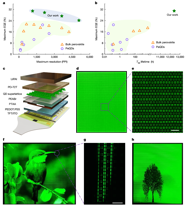 研究利用毛细管液桥技术实现了高达5080 PPI的超高分辨率阵列,其EQE(30.9%)和稳定性(T50超过1.2万小时)均代表了目前像素化钙钛矿LED的最高水平。