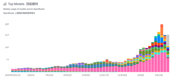 2026年初的OpenClaw热则直接改写了Token消耗逻辑,AI智能体一次复杂任务会触发数十次连续推理请求,Token消耗由此呈现指数级爆发的态势。▲OpenRouter平台上AI模型每周使用量趋势