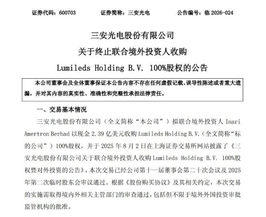 A 股LED龙头三安光电(600703)日前发布公告,宣布终止与境外合作方联合收购全球知名照明企业Lumileds全部股权的重大跨境资本运作,这场耗时近 8 个月、作价 2.39亿美元的海外并购,最终因境外严苛投资审查遗憾落幕。