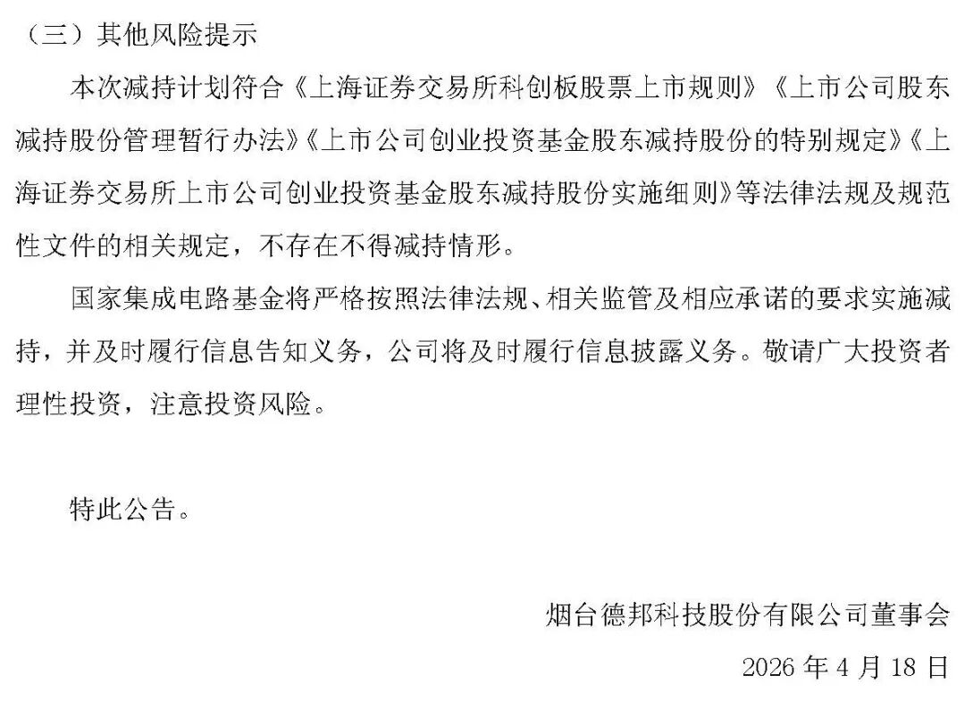 4月18日,烟台德邦科技股份有限公司(证券代码:688035,证券简称:德邦科技)发布公告称,公司持股5%以上股东国家集成电路产业投资基金股份有限公司(以下简称“大基金”)计划减持公司部分股份,合计减持数量不超过426.72万股,占公司总股本的比例不超过3%,减持原因系自身资金安排。