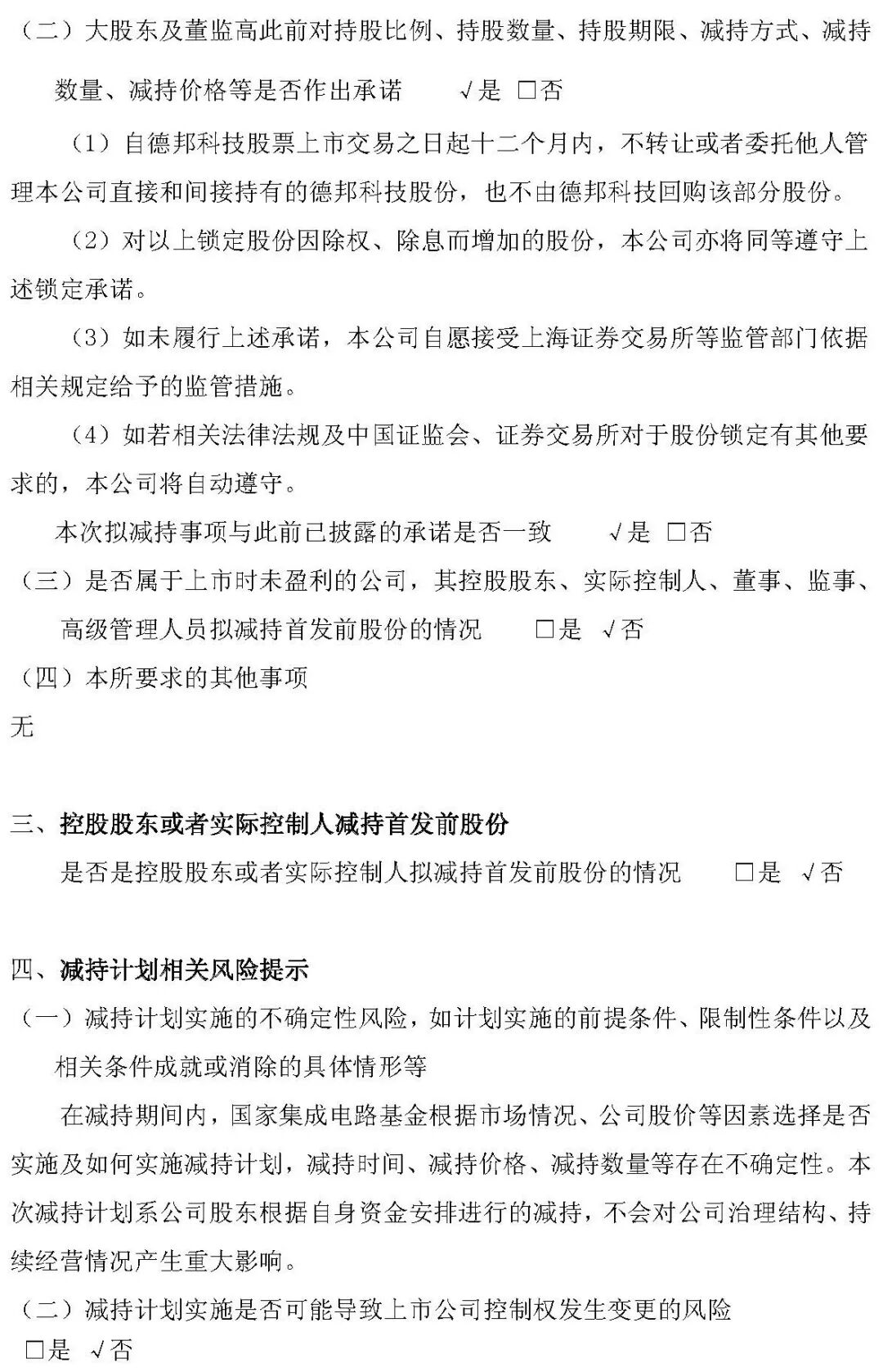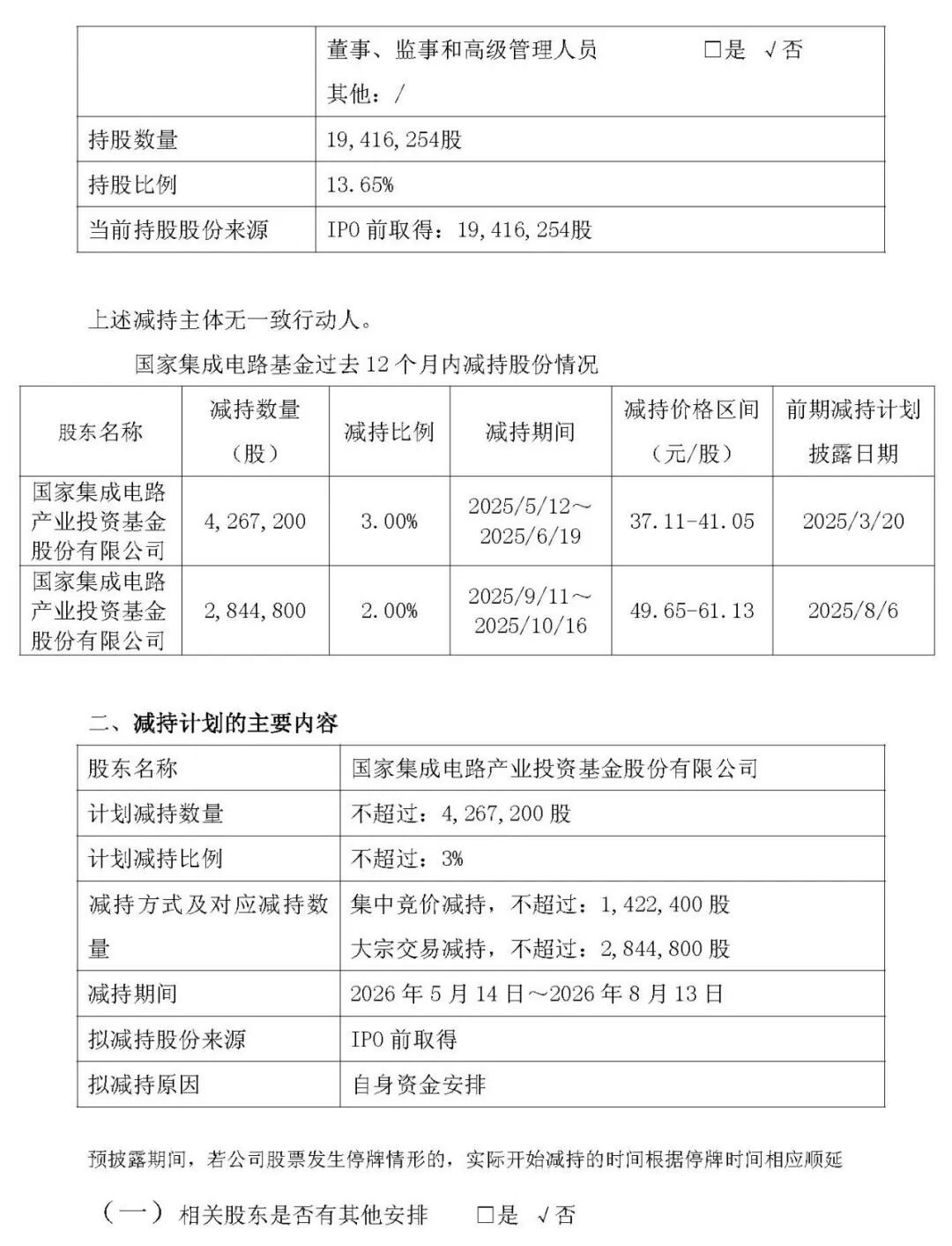 根据公开信息,国家集成电路产业投资基金(大基金)在过去12个月内对德邦科技实施了两次减持。第一次减持发生在2025年5月,通过大宗交易方式完成。第二次减持发生在2025年9月至10月期间,分两个阶段进行,通过集中竞价及大宗交易方式完成。两次减持后,大基金对德邦科技的持股比例逐步降低。