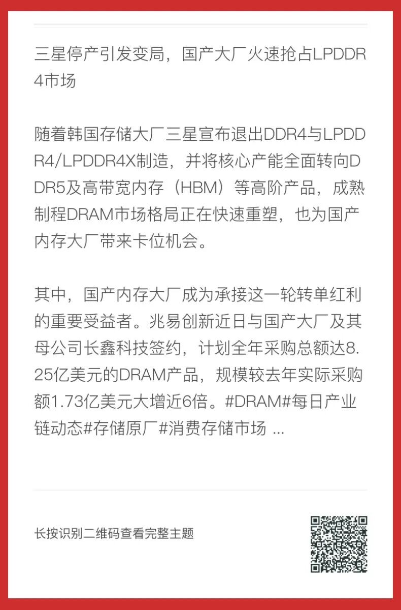 随着三星全面退出LPDDR4/LPDDR4X DRAM赛道,国产存储厂商正快速填补市场空白。