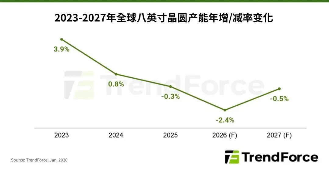 头部厂商的主动收缩叠加二线厂商的产能限制,据TrendForce集邦咨询2026年1月发布的报告显示,TSMC(台积电)、Samsung(三星)两大厂降低8英寸晶圆产能,将导致2026年全球8英寸总产能年减幅度达2.4%。