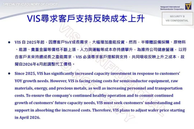 据媒体报道,3月13日,世界先进发出调价函,函件显示,2025年起,其响应客户需求大幅增加产能投资,但半导体设备采购、原料、能源、贵金属等价格不断上涨,人力与运输等成本亦持续攀升。为维持公司健康经营,以符合客户未来持续增长的产能需求,公司“必须寻求客户理解与支持,共同吸收反映上升的成本”,拟自2026年4月起调整代工价格。