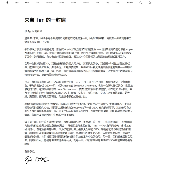 库克表示,担任苹果CEO是他毕生最大的荣幸,他热爱苹果,感激能与优秀团队共事,团队致力于丰富用户生活、打造顶尖产品与服务。此次交接,苹果未来走向备受关注。