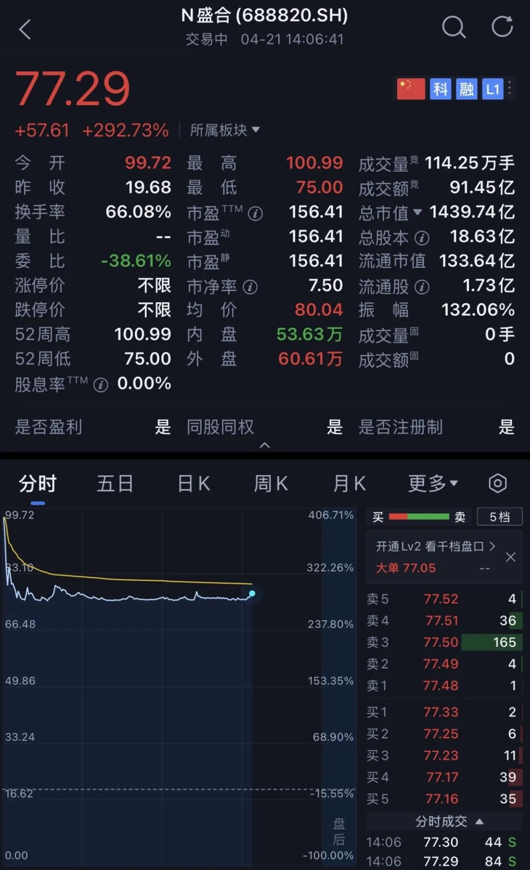 盛合晶微发行价为每股19.68元,开盘价每股99.72元,开盘大涨406.71%,截至14点前后,其股价最高为每股100.99元,最高涨幅达413.16%,最新股价为每股77.29元,涨幅达到292.73%,市值为1439.74亿元,盘中市值一度冲上1800亿元。