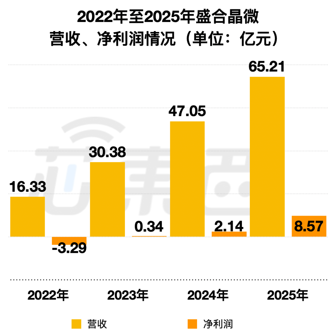 2022年、2023年、2024年、2025年,盛合晶微营收分别为16.33亿元、30.38亿元、47.05亿元、65.21亿元,净利润分别为-3.29亿元、0.34亿元、2.14亿元、8.57亿元。