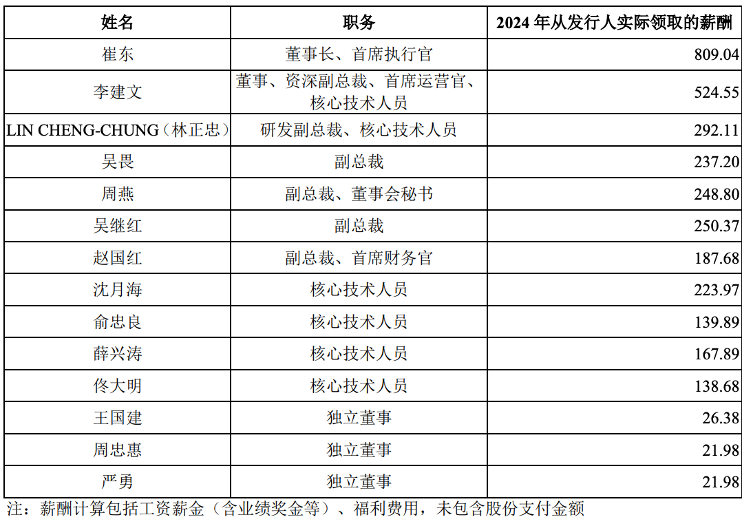 2024年度,从盛合晶微处领取薪酬的董事、高级管理人员及其他核心人员情况如下: