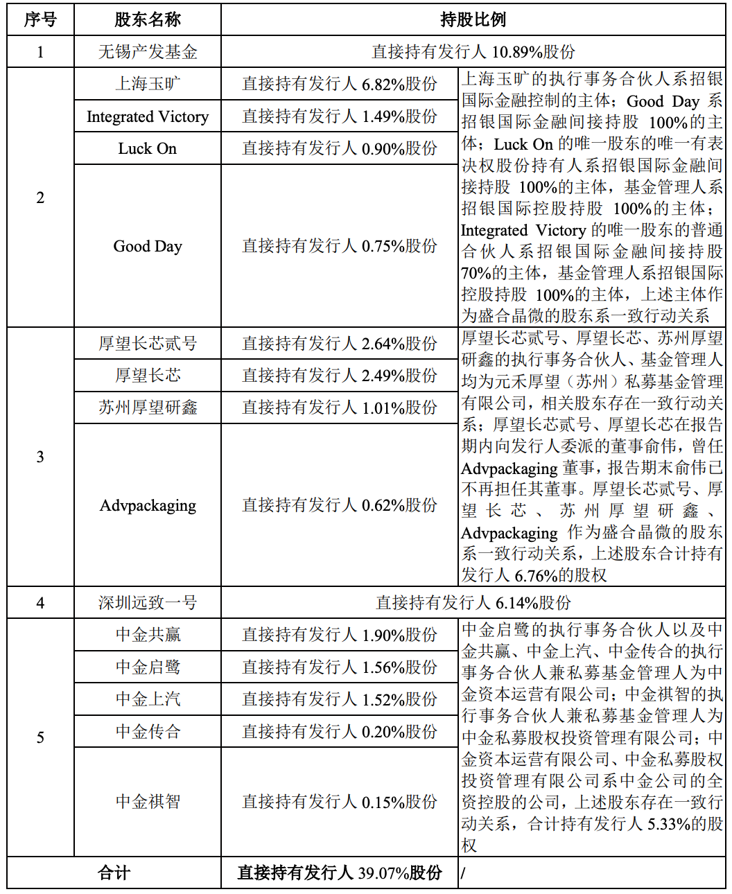 第一大股东为无锡产发基金持股比例10.89%,第二大股东招银系股东合计控制发行人的股权比例为9.95%,第三大股东深圳远致一号持股比例为6.14%,第四大股东厚望系股东合计持股比例为6.14%,第五大股东中金系股东合计持股比例为5.48%。